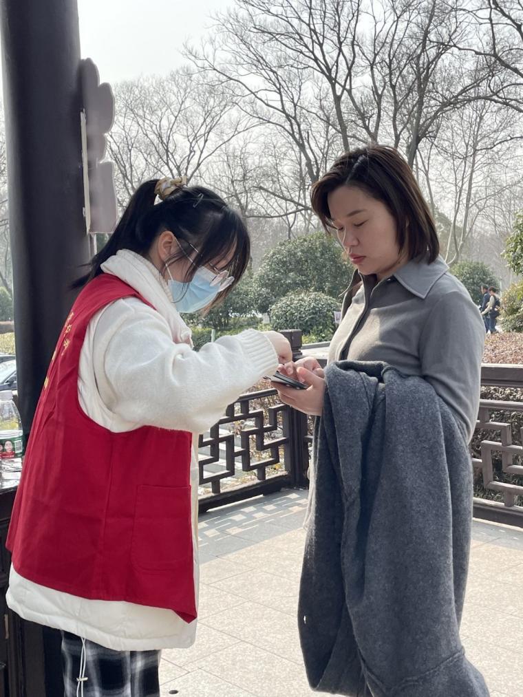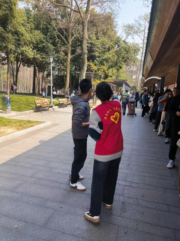 周末的景区人山人海,志愿者们始终坚守岗位、毫不松懈。他们用自己的热情与奉献完成志愿工作,在帮助他人的同时,也收获了满满温暖与成就感。志愿者温雯艳坦言,没想到自己能成功用英文与外国游客完成流畅地交流,并顺利帮助他解决了问题,一句简单的"Thank you"给她带来了极大的满足感;志愿者王朝阳分享到,一位小男孩问完路之后便离开了,他走了一段路后又走回来跟我说"谢谢哥哥",王朝阳坦言那一刻男孩纯真的笑容治愈了他一天的疲累;最让志愿者王顺林印象深刻的是大巴车的叔叔赠送他及其他志愿者的一瓶水,沉甸甸的一瓶水承载着大巴车叔叔对他们辛勤付出的认可和关爱……