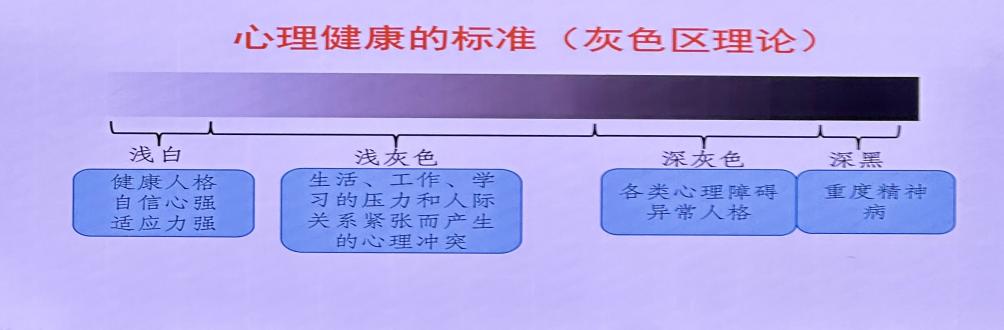 活动伊始,王过老师以"心理健康的标准——灰色区理论"为切入点,用清晰明了的图表和通俗易懂的语言,为同学们剖析了心理健康状态的"光谱"这一理论框架,帮助同学们建立起科学识别心理状态的基础认知,让大家明白心理健康并非简单的"健康"或"疾病"二元划分,而是一个动态、连续的过程。