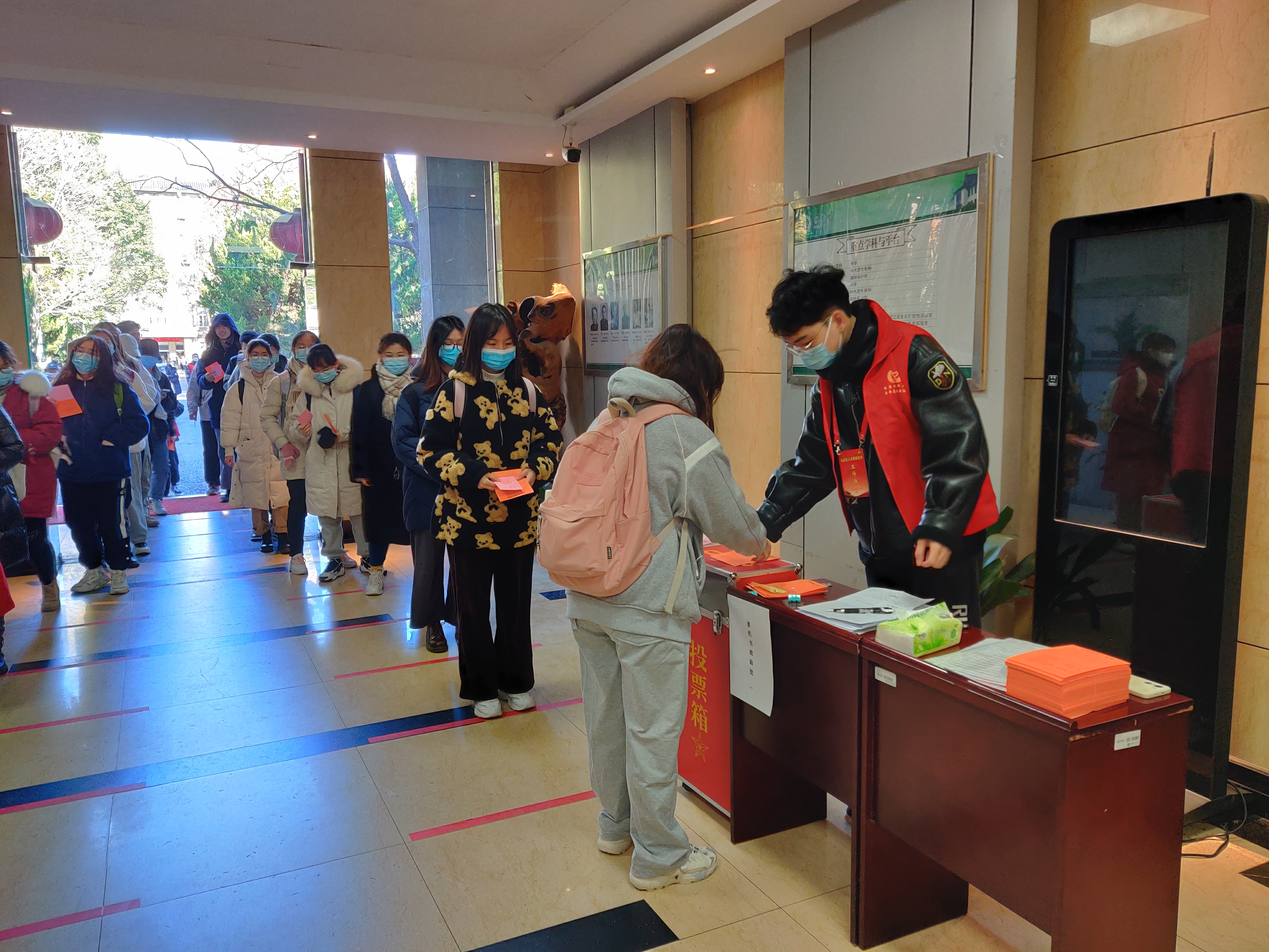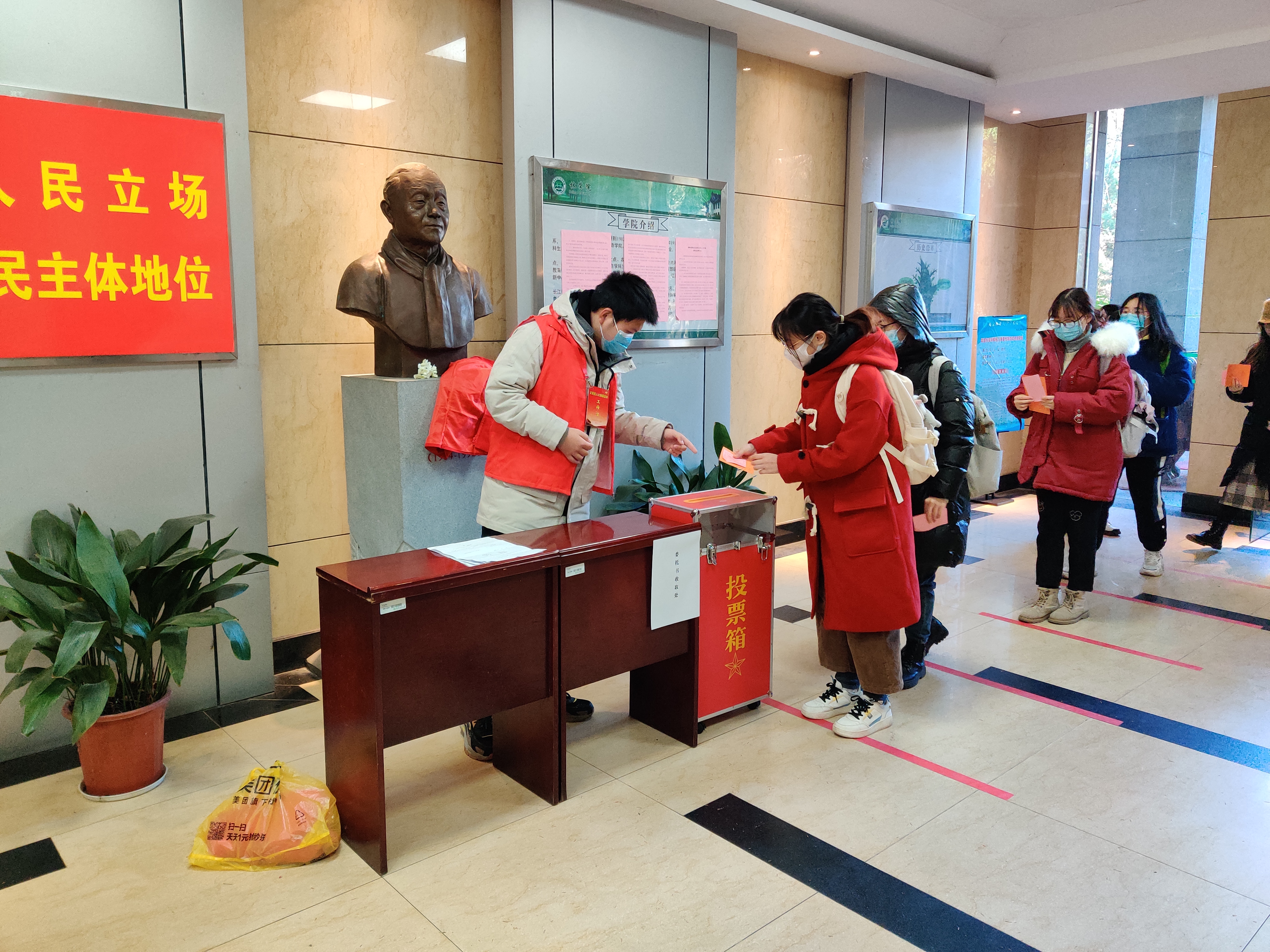 投票日前一天,院党委在学院一楼大厅张贴选举工作办法、选举标语,悬挂五星红旗,营造了浓郁的选举氛围。投票日当天,为方便选民投票,学院根据法定程序对此次选举工作周密部署、精心组织、认真实施,在一楼大厅共设置了2个投票站,近30名工作人员和志愿者参与了现场组织服务工作,整个选举过程严格按照程序井然有序地进行。从上午9点至下午2点,全院2千余名选民按序投下自己庄严的一票,积极行使选民权利。