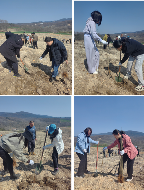植树现场,党员教师们分工明确,两人一组,一人负责挖坑,一人负责栽植培土,大家相互协作,干劲十足,现场一片热火朝天的劳动景象。在大家的共同努力下,一棵棵麻栎树苗被整齐地栽种在山地上,为白米山农场增添了一片新绿。