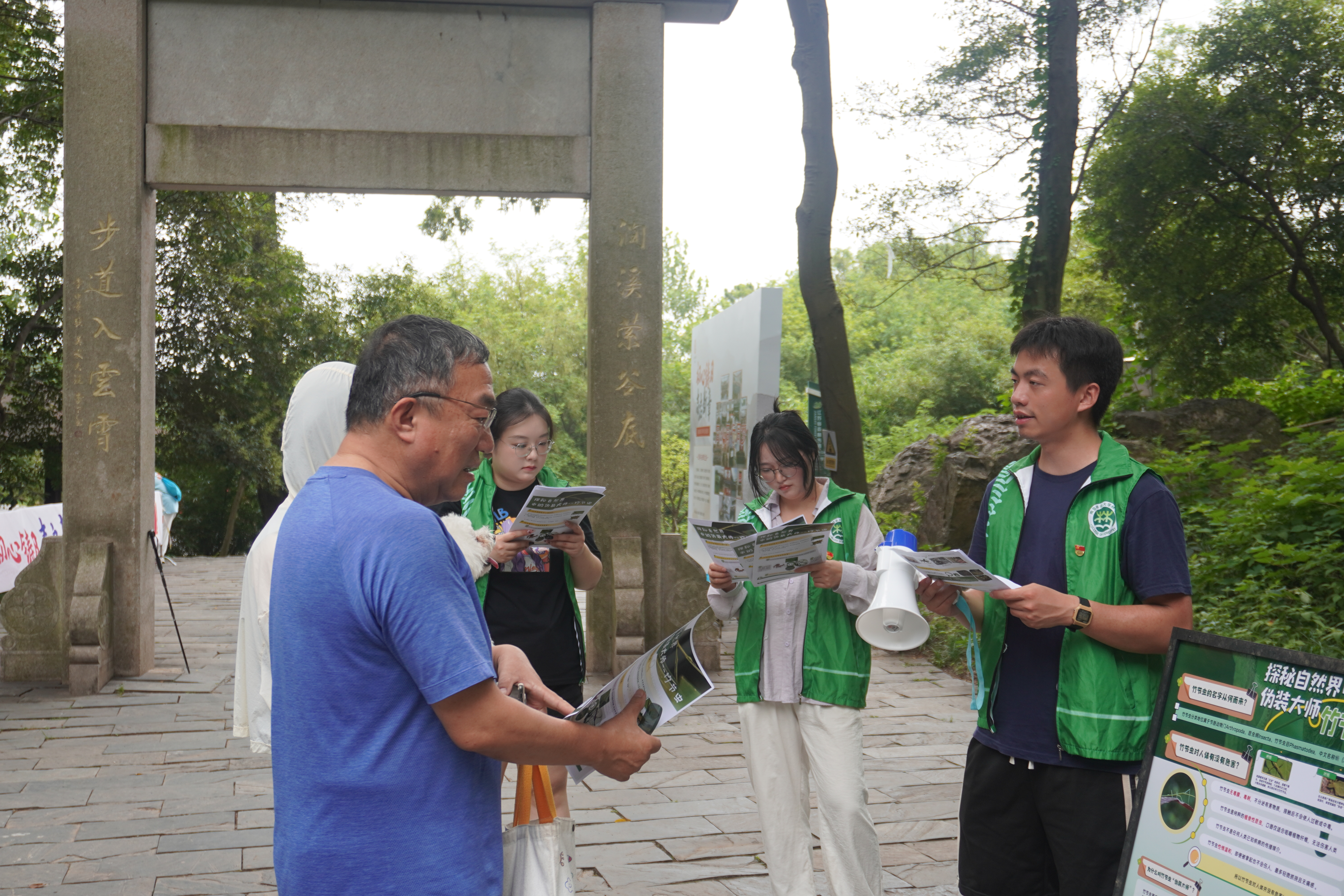 7月中旬的南京,艳阳高照、天气炎热,但前往老山吴家大洼等"网红"路线打卡的游人热度依旧不减。森林保护系的师生们带来了竹节虫的科普手册及展板,并进行了介绍和讲解。游客们对竹节虫提出了许多疑问,例如:它咬人吗?它有毒吗?它有天敌吗?师生们耐心解答了关于竹节虫的点点滴滴,打消游客们的顾虑和恐惧。师生们用专业知识告诉大家,竹节虫作为自然界的伪装大师,具有一定的科教和观赏意义;它们属于植食性昆虫,并且食量很小,对人类和植物无法产生伤害;它们没有毒腺、不分泌有毒物质、也不是任何人类已知疾病的传播媒介。