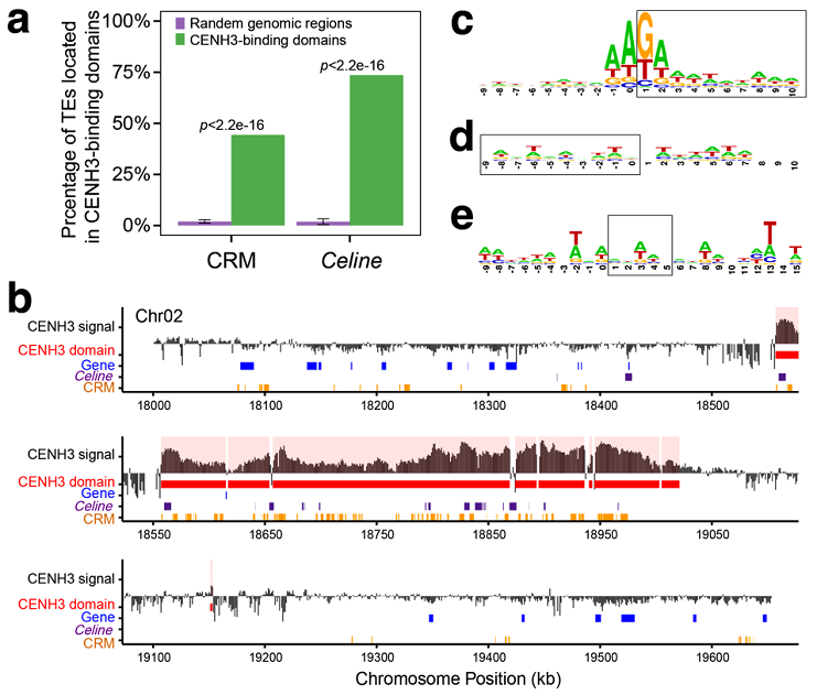 我们发现Celine优先定位于杨树每条染色体的功能着丝粒区域,84%的Celine位于CENH3结合域,而在毛果杨中,只有51%的CRM与CENH3结构域结合。这表明Celine和CRM采用了不同的着丝粒靶向机制,发现亲缘关系很远的Camellia sinensis和Fraxinus pennsylvanica部分染色体着丝粒区域也有Celine的分布。证明了Celine的着丝粒靶向特性是原始的,并且在远缘植物物种中保守。