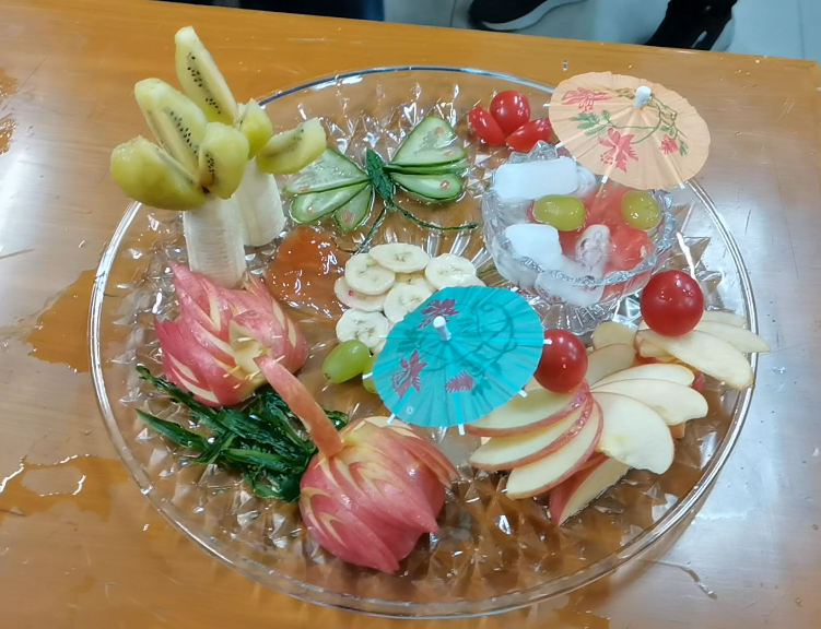 此次水果拼盘大赛共进行了两个回合的比拼,分别以“知否,是否,应是绿肥红瘦”以及“清凉一夏”为主题进行水果拼盘的制作。参与的七组同学使出了浑身解数,让美味的水果拼盘变成了一场视觉盛宴。