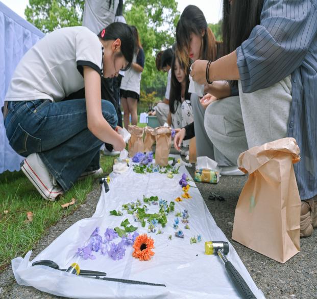 此外,伊莉讨论区 志愿者围绕"记录春天"主题,精心策划了一系列结合植物特色的活动。志愿者们热情邀请社区亲子家庭一同动手,收集春天的印记,并将其定格在画布上。在"植物乐手"摊位,志愿者引导大家采集落叶和花瓣,用锤拓技法在布上创作出属于春天的独特乐章;在"色彩入侵"摊位,参与者们拾取树枝和树叶,借助喷壶和颜料在画布上绘出春天的足迹。