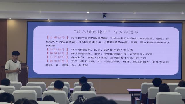 讲解"进入深色地带"的五种信号时,王老师结合自身经历,讲述曾遇到的案例:有同学长期被严重失眠困扰,明明课业压力不大,却每晚辗转难眠,白天又因睡眠不足昏昏沉沉,最初以为是普通压力导致,没太在意,后来发现该同学还出现自残现象,这正是"进入深色地带"的生理信号预警。案例让抽象理论具象化。同学们也更深刻意识到及时识别、干预的重要性,纷纷表示今后会更关注身边同学的异常表现。