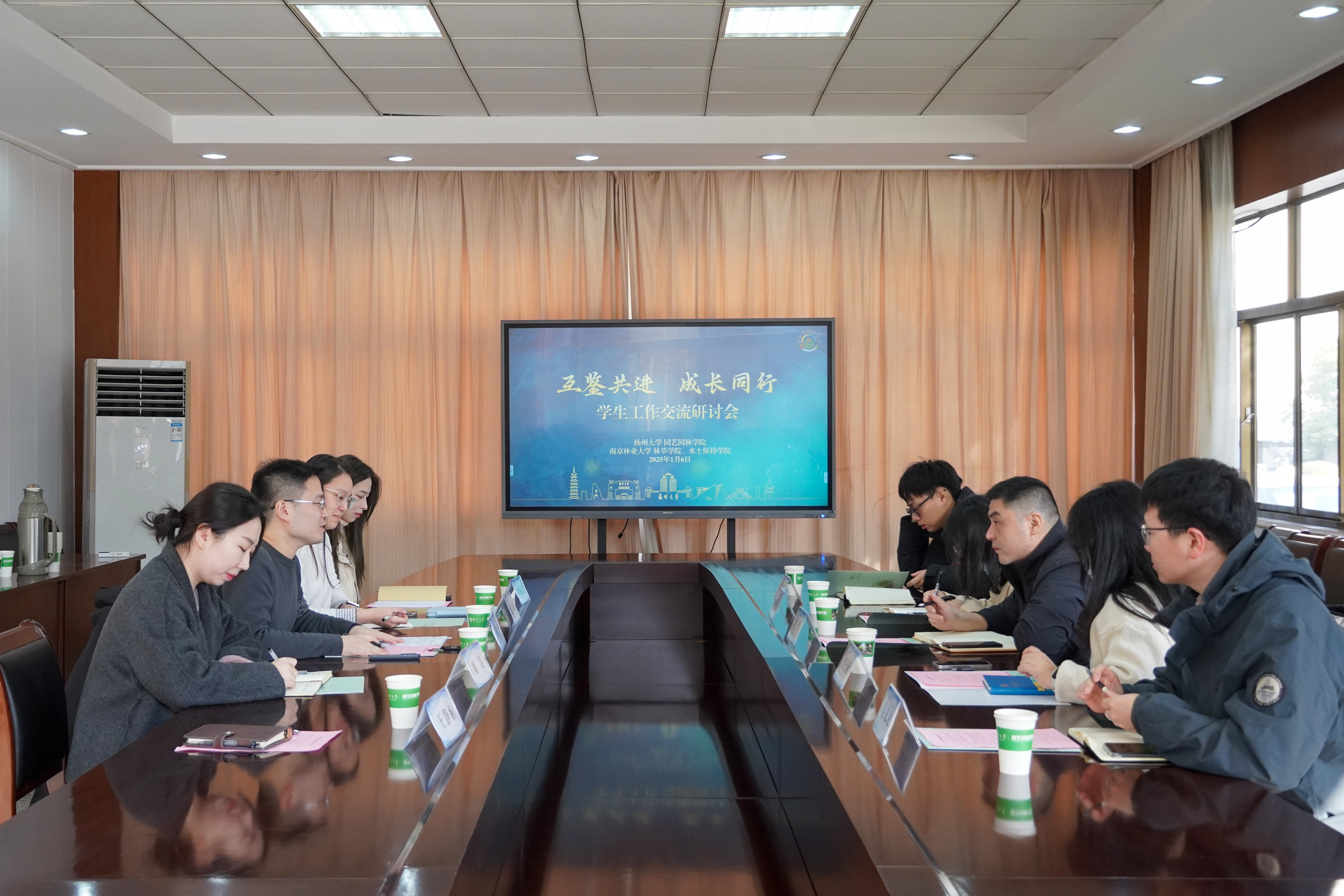 双方就各自学院开展的特色工作进行了介绍和分享。并就学生党员发展、学生干部队伍建设、学生就业、创新创业和挑战杯项目孵化及培育等方面展开了深入的探讨和交流。针对新形势下学生工作中的难点和痛点,双方学工人员深度剖析、互相借鉴,共同商讨应对的方案和对策。